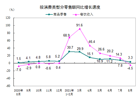 按消费类型分,8月份,商品零售30939亿元,同比增长3.3%;餐饮收入3456亿元,同比下降4.5%。1—8月份,商品零售252305亿元,同比增长16.5%;餐饮收入28919亿元,增长34.4%。