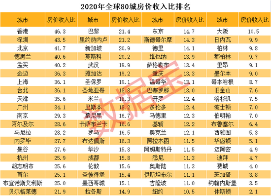 海外研究机构也给出了较为接近的房价收入比数据。英国数据库网站Numbeo公布的2020年全球80城房价收入比数据显示,深圳房价收入比达43.5位居榜单次席。全球买房最难的前十座城市中7座中国城市在列,包括了排名第一的香港,排名第三的北京,排名第七的上海等。