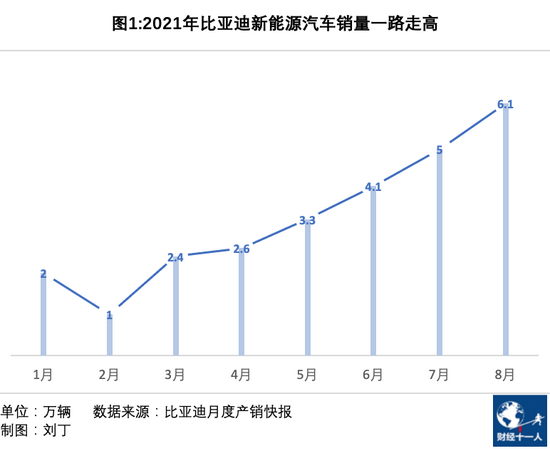 2021年5月,比亚迪销售了3.3万辆新能源车,这是2019年以来的月度销量首次超过3万;6月继续提高到4.1万辆,7月达到5万辆,8月达到6.1万辆。