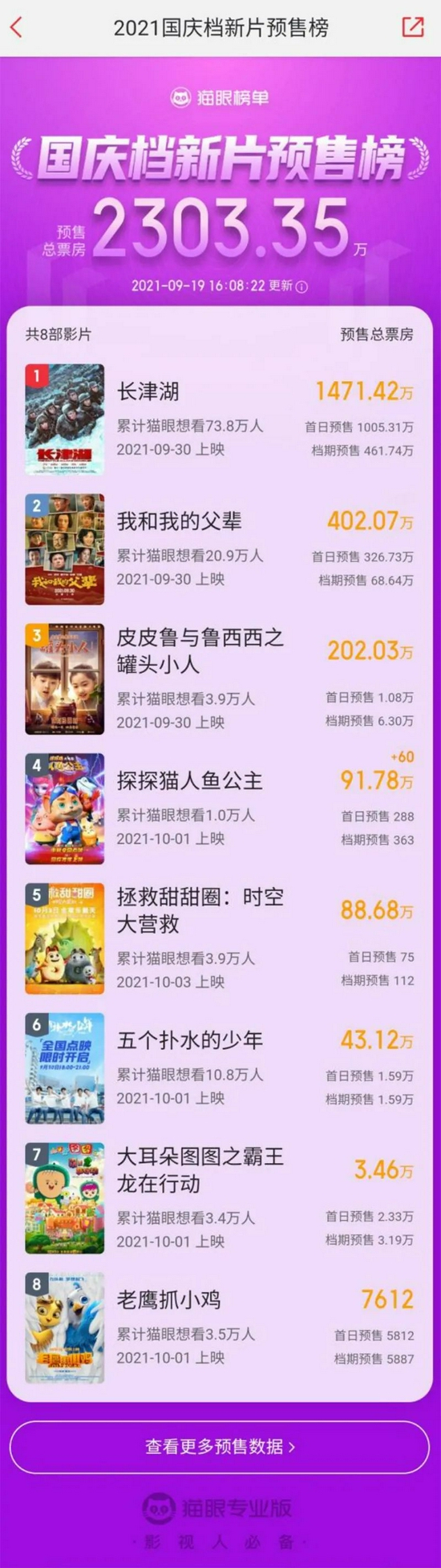数据方面,猫眼专业版显示,截至2021年9月19日16时08分,国庆档8部影片正在预售,预售总票房为2303.35万元,其中《长津湖》《我和我的父辈》分别拿下1471,42万元、402.07万元。