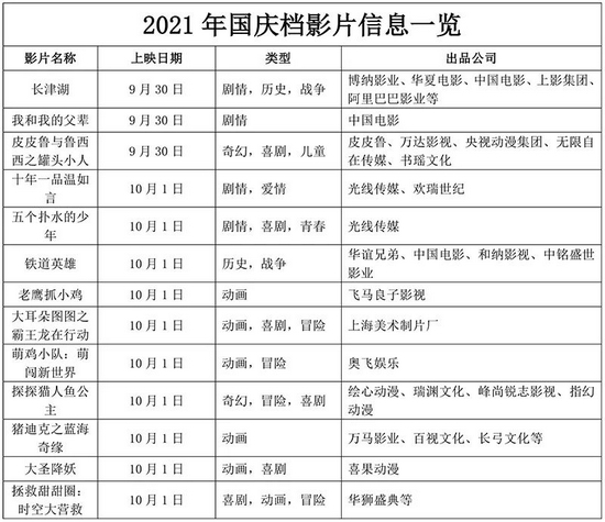与中秋档不同的是,国庆档电影题材以主旋律电影和动画电影为主,13部影片中有7部为动画电影。竞争格局方面,国庆档也更加清晰,两部主旋律电影《长津湖》《我和我的父辈》被业内看好,这两部影片的演员阵容十分强大,另一部主旋律影片《铁道英雄》则比较低调,暂未开启预售。