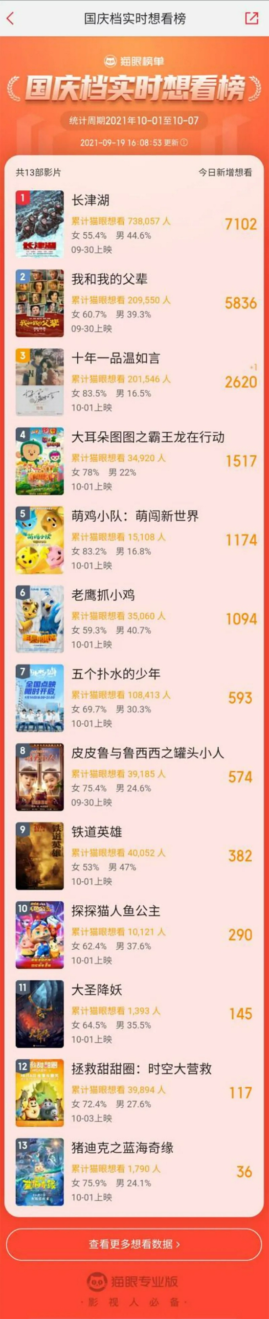 国庆档想看榜上,《长津湖》《我和我的父辈》也以70.8万、21.0万想看人数排在前两位。