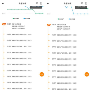 下调报价的情况并非个例。梅园三街坊一套46平方米左右的房源,在今年3月12日上架时的报价为850万元,随后在3月、5月、8月经过多次降价后,目前最低报价680万元。另一套48平方米的房源面临同样的境况,该房源上架时报价835万元,随后经过6次降价后,目前该房源最低报价625万元,价格下调幅度均超百万元。
