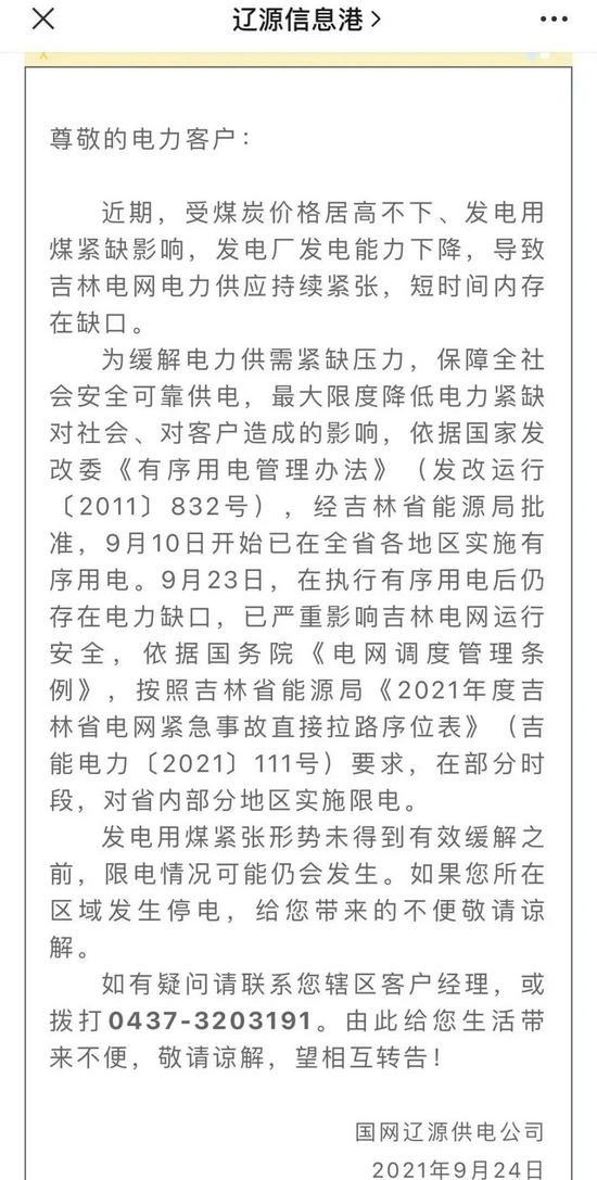 多份限电公告均显示,受煤炭价格居高不下、发电用煤紧缺影响,发电厂发电能力下降。为缓解电力供需紧缺压力,保障全社会安全可靠供电,最大限度降低电力紧缺对社会、对客户造成的影响,根据国家《有序用电管理办法》,经批准,已实施有序用电。