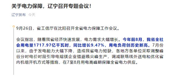 9月26日晚,辽宁发布消息称,9月26日,辽宁省工信厅在沈阳召开全省电力保障工作会议。会议指出,随着辽宁省经济快速发展,电力需求大幅增长。今年前8月,辽宁省全社会用电量1717.97亿千瓦时,同比增长9.47%,用电负荷创历史新高。7月份以来,由于发电能力大幅下降,造成辽宁省电力短缺,各地方各单位采取调整峰谷分时电价时段引导电熔镁企业错避晚尖峰生产,调减联络线外送电和优化省内机组开机方式等措施,在7至8月用电高峰期保障全省电力供应。