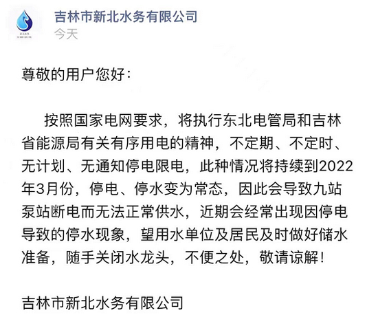 9月26日,吉林市新北水务有限公司在微信公众号上发布信息:按照国家电网要求,将执行东北电管局和吉林省能源局有关有序用电的精神,不定期、不定时、无计划、无通知停电限电,此种情况将持续到2022年3月份,停电、停水变为常态,因此会导致九站泵站断电而无法正常供水,近期会经常出现因停电导致的停水现象,望用水单位及居民及时做好储水准备,随手关闭水龙头,不便之处,敬请谅解!不过,截至发稿,该信息已经被发布者删除。