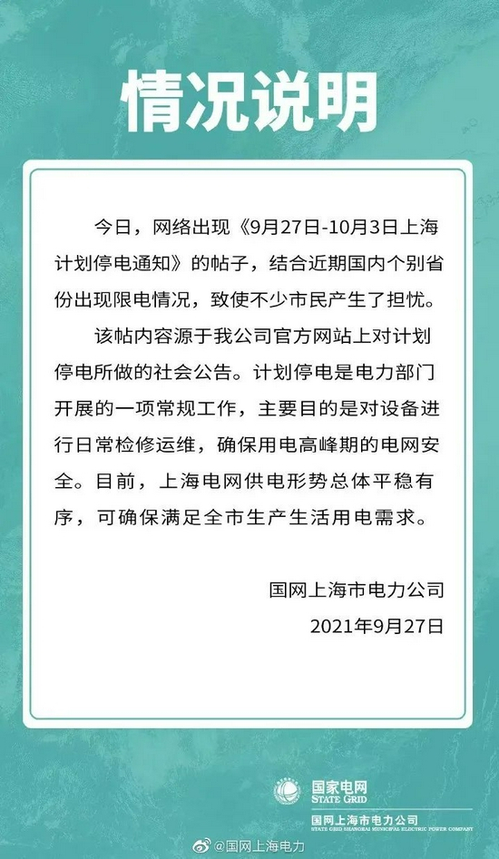 这两天,一份名为《9月27日—10月3日上海计划停电通知》的帖子通过社交网络传播。根据该帖子,上海有多个地区将计划停电,同时涉及居民用电和商业用电。有网友担心,此次停电是否与部分城市的拉闸限电相类似?根据《上海市供用电条例》的规定:“供电企业因计划检修采用公告方式通知停电的,应当至少提前七日在相关社区、供电企业网站和服务应用软件公告停电区域、停电线路和停电时间,或者通过本市媒体公告。”所以,此次网传的计划停电信息均为国家电网上海公司的计划停电公示,并非限电通知。如果仔细阅读相关通知还能发现,其中大部分涉及居民小区的停电计划都在清晨7时前完成。从这一时间安排也不难发现,这是为了尽可能减少停电对居民生活的影响。业内人士还进一步解释,计划停电信息中所列道路或区域仅为可能发生停电的大致范围,并不表示提到的整条道路或区域。同时,电力检修的总体原则是尽最大可能降低停电时间,减少对生产生活的影响。所以,计划停电信息是提示性公告,停电范围和时间有可能因实际情况而发生变动。在实际操作中,供电部门会下发停电通知单,由专人送达街道、居委会后在社区公共区域张贴,更加准确地提供停电的详细信息。此外,上海已经越来越多地在电网设备检修中启用了带电检修技术,还有很多用电客户使用双回路供电,即使一条计划停电,也不影响另一条线路继续供电。从总体看,计划停电对生活生产影响比较小,与拉电限电更是没有关系。