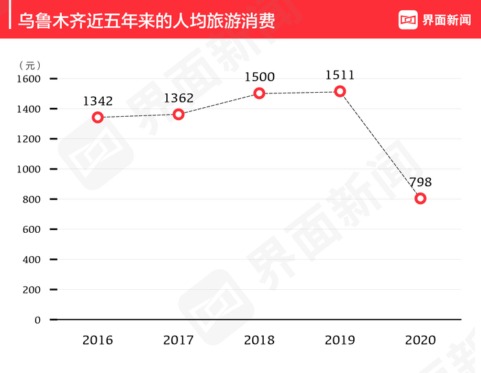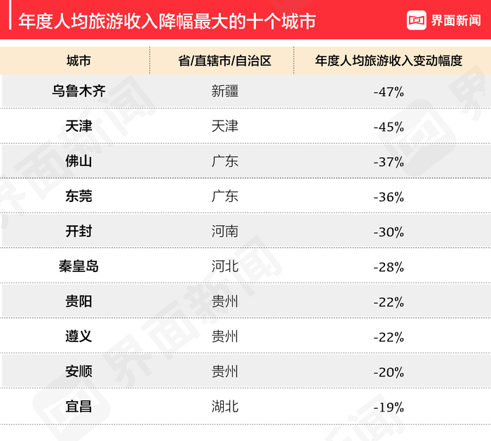 从人均旅游消费结构来看:将这50个城市的人均旅游消费情况按金额划分为四个区间,其中人均旅游消费在800元以下的城市仅有3个;而另外三个区间分布较为均匀,人均旅游消费超过1000元的城市和在900元到1000元之间的城市各有15个;在800元到900元之间的城市有17个。与去年相比,今年的人均旅游消费分布更向中间两个区间聚集。上榜的50个城市中,乌鲁木齐的年度人均旅游收入变动幅度最大,下降了47%;天津紧随其后,较上一年下降了45%。