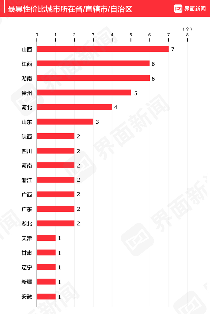 这50个上榜城市分布于18个省/直辖市/自治区。山西省今年有7个城市进入最具性价比旅游城市的榜单,江西省和湖南省各有6个。贵州省的5个上榜城市中有3个进入榜单前十。