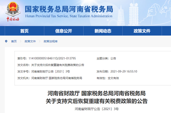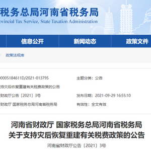 为加快灾后重建,支持河南省遭受洪涝灾害地区早日恢复正常生产生活秩序,9月30日,经河南省政府同意,河南省财政厅、国家税务总局河南省税务局发布关于支持灾后恢复重建有关税费政策的公告(以下简称“公告”)。