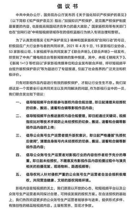今年4月以来,爱奇艺、优酷与腾讯视频三家联合70家影视制作公司联合声讨短视频平台侵权。紧接着,李冰冰、赵丽颖等上百名艺人加入声讨行列,共同发表“联合声明”和“联合倡议书”反对抖音、快手等平台的网络短视频侵权行为。