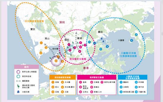 “双城三圈”这一概念应运而生!“双城”是香港和深圳;“三圈”即由西至东分别为深圳湾优质发展圈、港深紧密互动圈和大鹏湾/印洲塘生态康乐旅游圈。这是林郑施政报告的重点内容,同时也是《北部都会区发展策略》的核心。施政报告指出,“双城三圈”空间概念的确立,有利港深政府可共同促进两地在经济、基建、创科、民生和生态环境的紧密合作,发挥强强联手,产生一加一大于二的效益。
