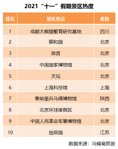 景点方面,成都大熊猫繁育研究基地拔得头筹,各个年龄段的游客都无法拒绝憨态可鞠的“国宝”,使得这里成为赴成都游客的必打卡景点。而凭借着“环球影城效应”,大批游客在十一期间仍将目光锁定北京,在热度排名前10的景点中,北京景点独揽“半壁江山”,除环球影城之外,颐和园、故宫、中国国家博物馆、天坛等国人耳熟能详的名胜古迹节日期间人潮汹涌。