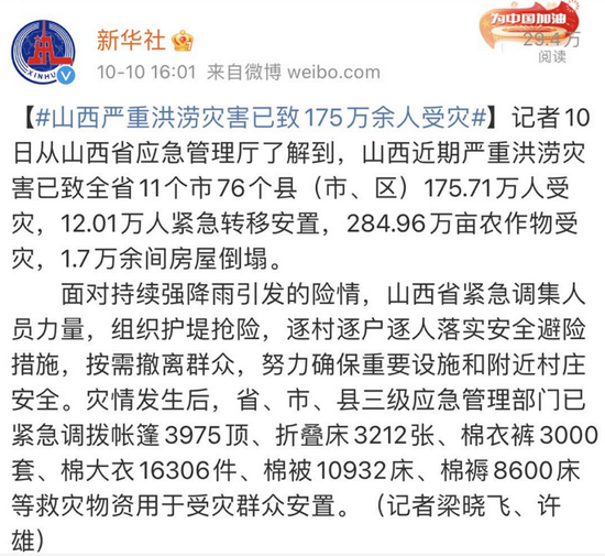 据新华社微博最新消息,山西省应急管理厅:山西近期严重洪涝灾害已致全省11个市76个县(市、区)175.71万人受灾,12.01万人紧急转移安置,284.96万亩农作物受灾,1.7万余间房屋倒塌。