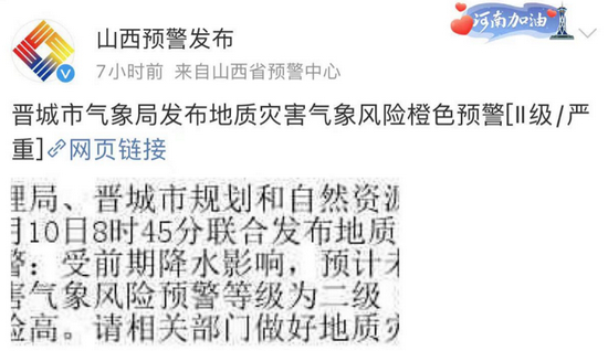 最近,山西暴雨牵动人心!据最新消息,山西晋城气象局发布地质灾害气象风险橙色预警[Ⅱ级/严重]。晋城市应急管理局、晋城市规划和自然资源局、晋城市气象局联合发布预警称:受前期降水影响,预计未来24小时内晋城市地质地质灾害气象风险橙色预警为二级(橙色),发生地质灾害的风险高。