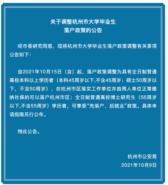 昨日傍晚,杭州市公安局发布《关于调整杭州市大学毕业生落户政策的公告》,公告表示,自2021年10月15日(含)起,落户政策调整为: