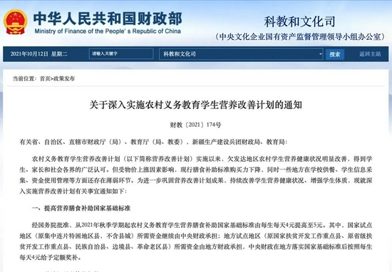 近日,财政部、教育部印发通知进一步提高学生营养膳食补助标准