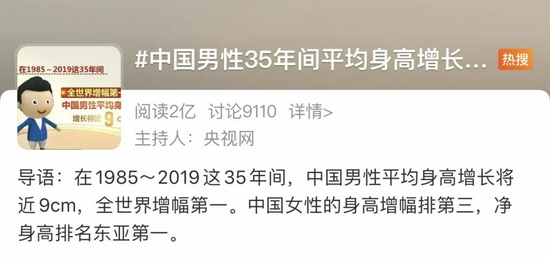 近日,“中国男性35年间平均身高增长9厘米”登上微博热搜。