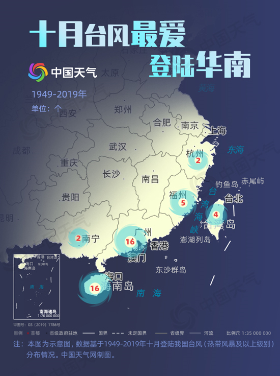 10月生成的台风属于秋台风,气象大数据显示,秋台风路径相对偏南,登陆点多集中在华南地区,过去72年间,秋季基本没有台风登陆江苏及其以北地区。1949-2019年期间,在十月份登陆我国的台风共有45个,其中登陆海南和广东的最多,均为16个。此外福建有5个,台湾有4个,广西和浙江分别有2个。