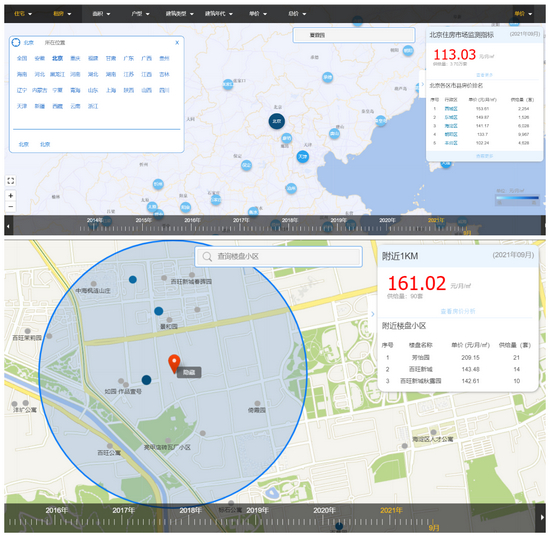 全国房价行情网数据显示,2021年9月北京平均住宅出租价格为113.03元/月/平米。若以腾讯北京总部为圆心,附近1千米内的住宅平均租金为161.02元/月/平米,比全市平均价格高约48元/月/平米。