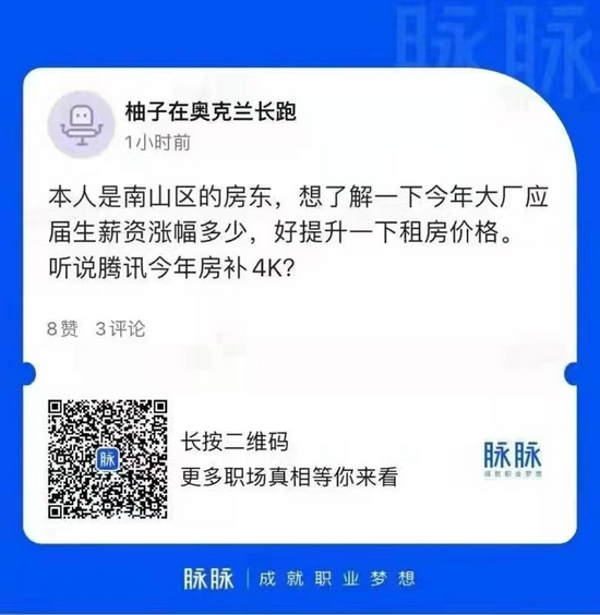 近日,一则“房东借问大厂房补涨了没”的帖子引发热议。一名自称深圳南山区房东的用户在脉脉平台上表示,为房子涨租做准备,想了解今年互联网大厂应届生薪资涨幅,以及腾讯今年房补是不是确定涨到每月4000元。