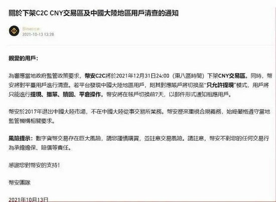 10月13日,币安发布通知,将在12月31日24时下架C2C CNY交易区,并将对中国大陆地区用户清查。根据通知,若发现中国大陆地区用户,对应账户将切换至“只许提现”模式,用户只能进行提现、撤单、赎回、平仓操作。