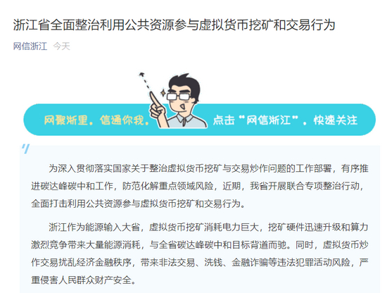 据微信公众号“网信浙江”14日消息,近期,浙江省开展联合专项整治行动,全面打击利用公共资源参与虚拟货币挖矿和交易行为。