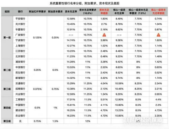 以核心一级资本充足率为例,按照《规定》,目前一至五组银行的核心一级资本充足率下限分别为7.75%、8%、8.25%、8.5%、9%。由此测算,包括平安银行、华夏银行、江苏银行、中信银行、民生银行、兴业银行的核心一级资本充足率距离下限较近,其中民生银行仅0.52个百分点。