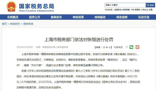 10月18日,税务部门公布了对张恒的处罚结果。张恒作为郑爽参演《倩女幽魂》的经纪人,帮助郑爽掩盖“天价片酬”,规避行业主管部门监管,逃避履行纳税义务,被依法处以3227万元罚款。