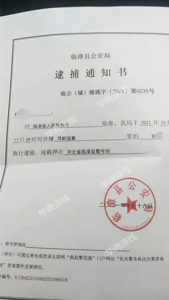 杨女士说,9月11日上午,当地警方通知她丈夫到派出所协助调查。当天下午,因“涉嫌寻衅滋事罪”,她丈夫被刑事拘留。10月17日,经临漳县人民检察院批准,她丈夫被批捕。