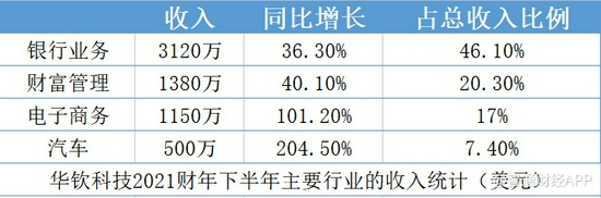 而从行业分类上看,来自银行业务的收入增长36.3%至3120万美元,占期内总收入的比例为46.1%;财富管理领域的收入为1380万美元,同比增长40.1%,占期内总收入的比例为20.3%;电子商务领域的收入则增长101.2%至1150万美元,占比为17%,同比提升近5个百分点;汽车领域收入为500万美元,同比增长204.5%,占比为7.4%,同比提升近4个百分点;来自其他行业的收入占比则为9.2%。