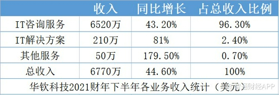 从业务类型来看,由于现有客户、新增客户需求的增加,以及公司交付能力的提升,报告期内的IT咨询服务收入增长43.2%至6520万美元,占总收入的比例为96.3%;IT解决方案则由于现有客户需求的增加,收入增长81%至210万美元,占总收入的比例为2.4%;其他服务的收入增长179.5%至50万美元,占总收入的比例为0.7%。显然,IT咨询服务是华钦科技的核心业务。