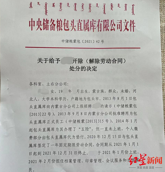 红星新闻记者从一份中储粮包头直属库开除小李的红头文件中看到,2013年8月1日,包头直属库向内蒙古分公司上报招聘小李的请示,2013年9月8日内蒙古分公司批准聘用为包头直属库正式员工(中储粮蒙2013 315号)。2014年1月起,包头直属库为其办理了“五险”,但一直未上班,个人缴费部分由包头直属库代为垫付。