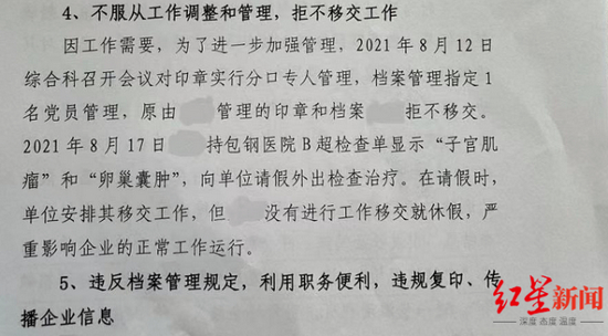 对于以上内容,小李在接受红星新闻采访时表示并不认同文件内容,最让她不满的是,单位将她所患妇科疾病写入文件,当众宣读并传阅全单位,严重侵犯了个人隐私。