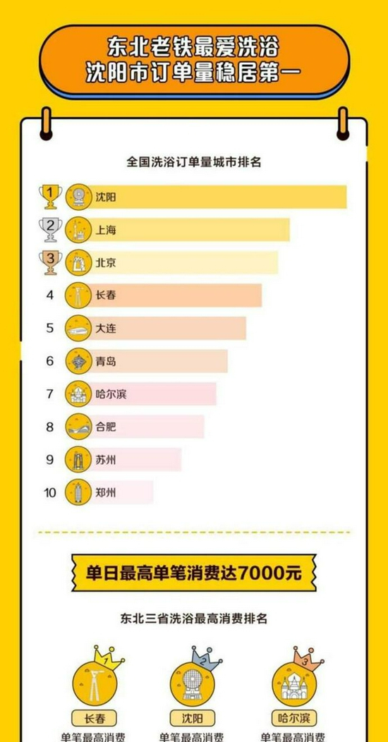 东北人在洗澡上的花费是毫不吝啬的,2020年美团App大数据显示,在双十一全国洗浴消费订单量排名中沈阳稳居第一。