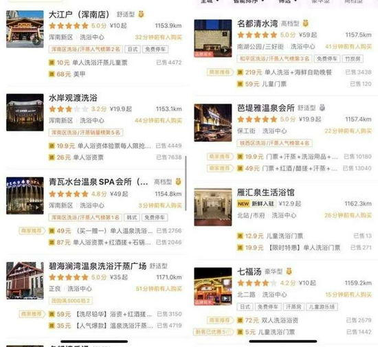打开美团筛选洗浴分类,沈阳的洗浴中心门票的价格范围从最低的5块钱到247元不等,而百元以内的洗浴中心占了大头。