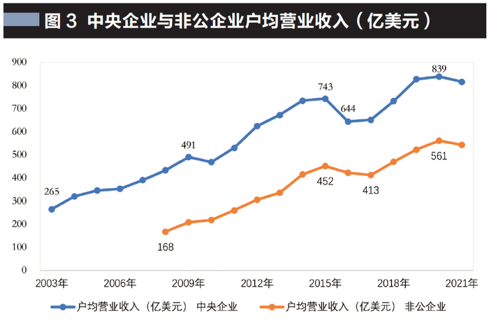 户均营业收入方面,2003—2021年,中央企业由265亿美元增加到816亿美元,年均增长6.4%;非公企业由168亿美元增加到543亿美元,年均增长6.7%。
