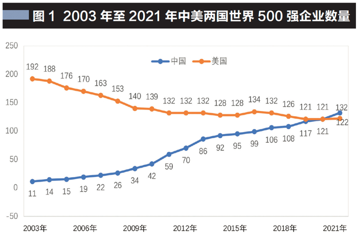 再看美国方面,2003年,美国企业入选世界500强的企业为192家。此后,其数量不断下降,2021年为122家,位居第二,数量在2003—2021年的平均增速为-2.5%(详见图1所示)。
