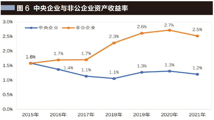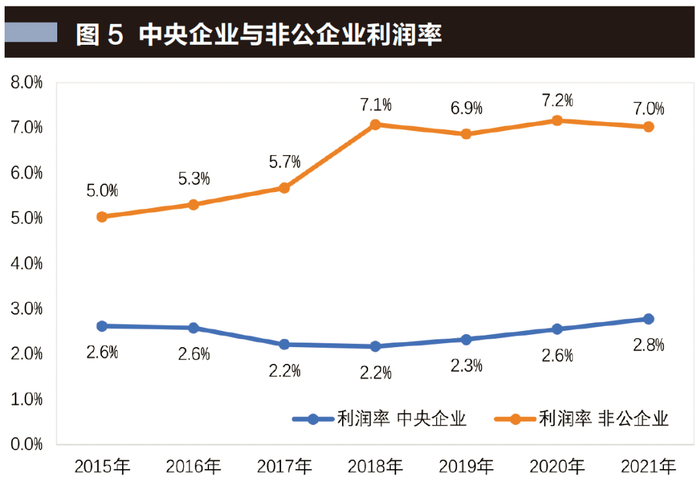 中央企业与非公企业绩效比较。我们选择2015—2021年的利润率、资产收益率两个指标进行比较分析。