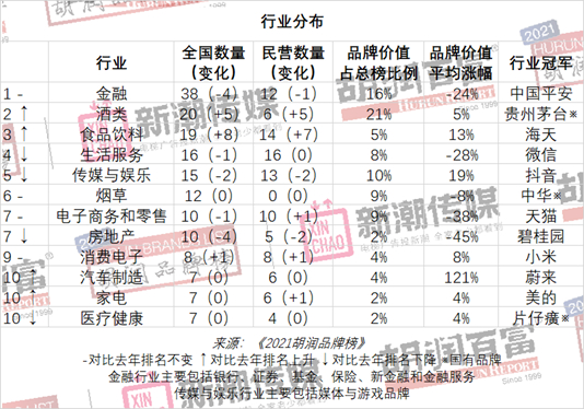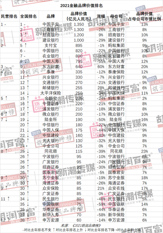 中国平安和工商银行蝉联最具价值金融品牌前两名,中国平安品牌价值比去年下降34%至1,350亿元,工商银行品牌价值比去年下降26%至1,300亿元;招商银行从第五上升至第三,品牌价值比去年上涨9%至1,200亿元。38个上榜金融品牌中有12个是民营品牌。上榜金融品牌的品牌价值总和占整张榜单16%。总部在北京的最多,有14个。