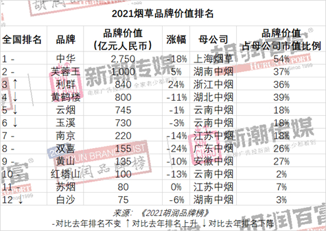 中华蝉联最具价值烟草品牌,但品牌价值比去年下跌18%至2,750亿元;利群从第六上升至第三,品牌价值比去年上涨24%至840亿元。今年有12个烟草品牌上榜,全部都是国有品牌。上榜烟草品牌的品牌价值总和占整张榜单9%。