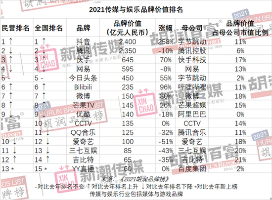抖音取代腾讯成为最具价值传媒娱乐品牌,品牌价值上涨至去年的3.5倍,达到2,400亿元。腾讯降至第二,品牌价值比去年下降10%至2,350亿元。快手上升一位至第四,品牌价值比去年上涨70%至645亿元。传媒娱乐行业共有15个品牌上榜,其中13个民营品牌。上榜品牌的品牌价值总和占整张榜单10%。北京是传媒娱乐行业上榜品牌最多的地区,有7个。