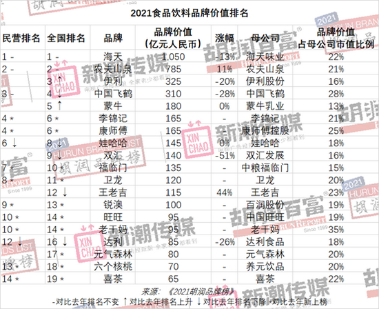 海天蝉联最具价值食品饮料业品牌,但品牌价值比去年下降13%至1,050亿元;农夫山泉保持第二,品牌价值比去年上涨11%至785亿元;伊利从第四升至第三,但品牌价值比去年下降20%至325亿元。食品饮料行业共有19个品牌上榜,其中14个为民营品牌。上榜品牌的品牌价值总和占整张榜单5%。
