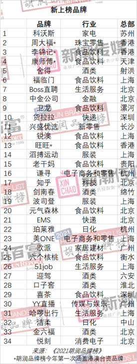34个新上榜品牌,来自食品饮料行业的最多,有10个。企业总部在北京和上海的最多,分别有7个。胡润品牌榜今年第一次涵盖港澳台资品牌,一共有4个上榜,以周大福和李锦记为首。