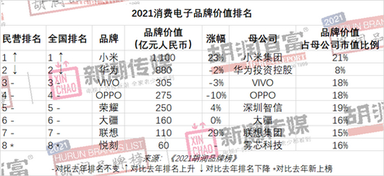 2021胡润消费电子行业品牌榜:小米品牌价值1100亿夺冠,华为、vivo进入前三