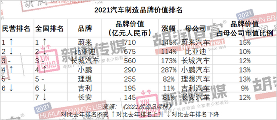蔚来取代比亚迪成为最具价值汽车品牌,品牌价值上涨至去年的2.5倍,达到710亿元;比亚迪降至第二,但品牌价值仍然比去年涨了一倍,达到675亿元;长城汽车保持第三,品牌价值上涨至去年的近3倍,达到560亿元。汽车制造行业有7个品牌上榜,其中6个是民营品牌,品牌价值总和占整张榜单4%。