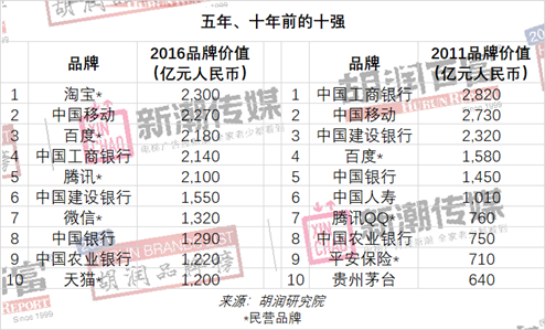 十年前,前十名门槛为640亿,当时的前十名中,还有腾讯、贵州茅台两个品牌今年还在前十。五年前,前十名门槛翻倍到1,200亿,当时的前十名中,还有淘宝、腾讯、微信、天猫四个品牌今年还在前十。今年,前十名门槛上升至1,400亿,是十年前的2倍多。
