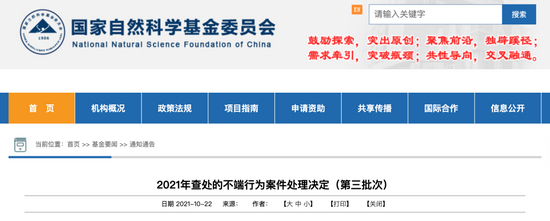 10月22日下午,国家自然科学基金委员会官网发布了《2021年查处的不端行为案件处理决定(第三批次)》。