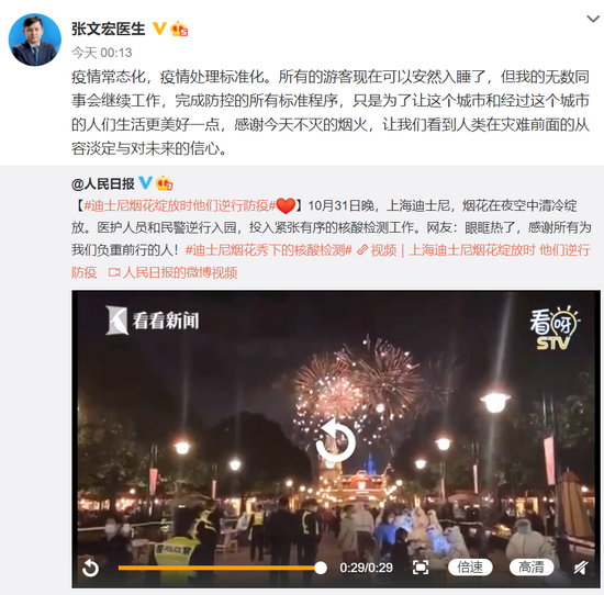 复旦大学附属华山医院感染科主任张文宏医生转发人民日报微博称,“疫情常态化,疫情处理标准化。所有的游客现在可以安然入睡了,但我的无数同事会继续工作,完成防控的所有标准程序,只是为了让这个城市和经过这个城市的人们生活更美好一点,感谢今天不灭的烟火,让我们看到人类在灾难前面的从容淡定与对未来的信心。”