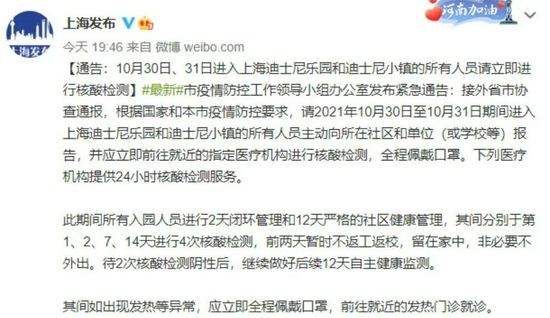 对于园区游客后续处置情况,“上海发布”发布消息称,请2021年10月30日至10月31日期间进入上海迪士尼乐园和迪士尼小镇的所有人员,主动向所在社区和单位(或学校等)报告,并立即前往就近的指定医疗机构进行核酸检测。以上所有人员进行2天闭环管理和12天严格的社区健康管理,其间分别于第1、2、7、14天进行4次核酸检测,前两天暂时不返工返校,留在家中,非必要不外出。待2次核酸检测阴性后,继续做好后续12天自主健康监测。